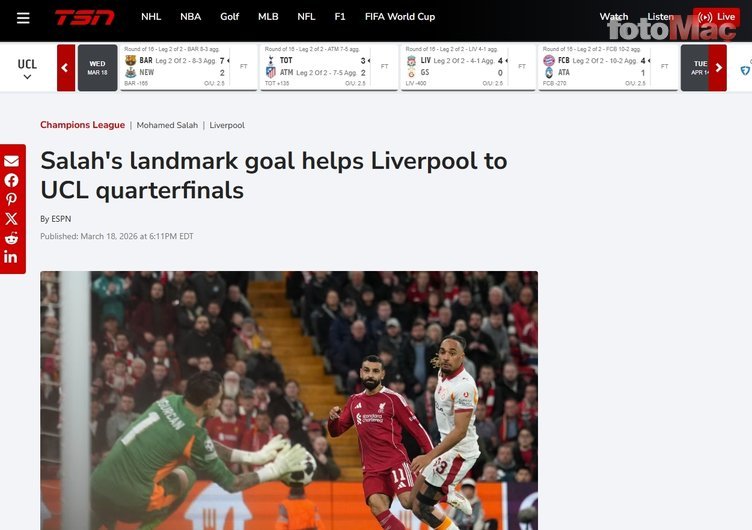 TSN | Salah, 50. Şampiyonlar Ligi golüyle kulüp tarihine geçti, Liverpool, Galatasaray’ı rahat eledi.