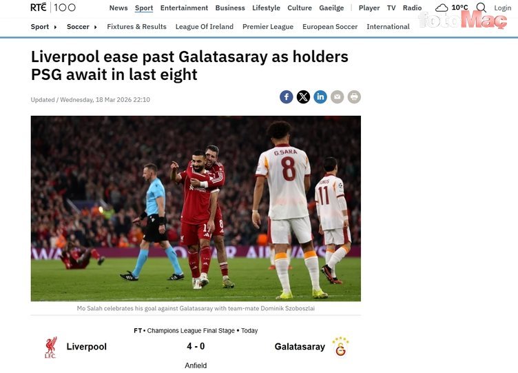 RTE | Liverpool, Galatasaray’ı rahat geçti ve son 8 takıma arasına kaldı.