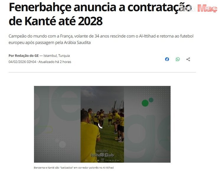 GE.GLOBO: Fenerbahçe, Kante ile 2028 yılına kadar geçerli bir sözleşme imzaladığını duyurdu