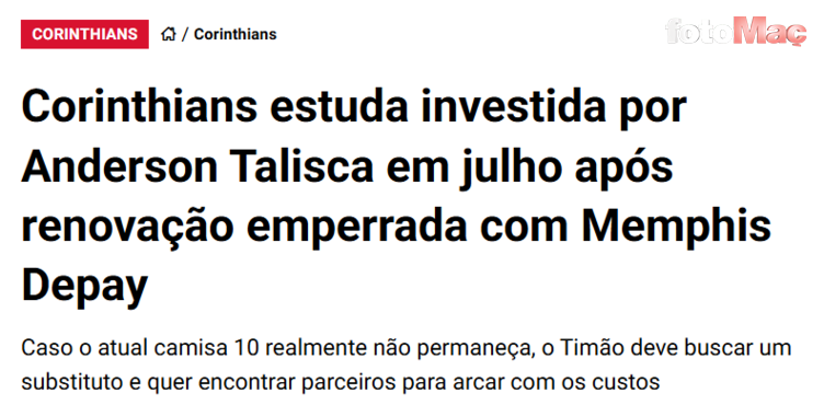 Bolavip’te yer alan habere göre Corinthians, sezon sonunda sözleşmesi bitecek Memphis Depay ile anlaşma sağlayamadığı durumda Talisca için harekete geçecek.