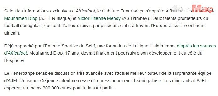 Africafoot’un haberine göre sarı-lacivertliler, Senegal Premier Lig’de Ajel de Rufisque takımında oynayan Mouhamed Diop transferini sonuçlandırmaya hazırlanıyor.