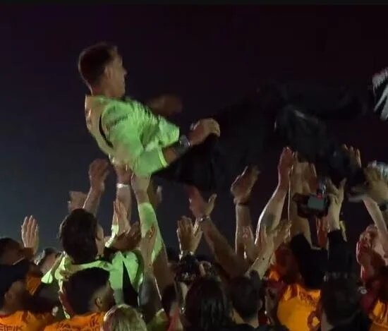 Galatasaraylı oyuncular daha sonra Muslera’yı omuzlarına aldı ve havaya fırlattı.