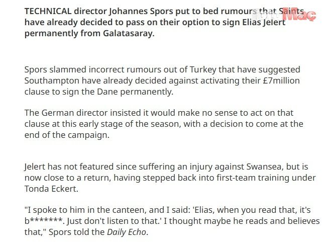 Southampton Sportif Direktörü Johannes Spors, Danimarkalı oyuncu için 7 milyon sterlinlik satın alma maddesini devreye sokmamaya karar verdiğini öne süren yanlış haberleri sert bir dille yalanladı. Yapılan haberler hakkında konuşan Spors, “Onunla kantinde konuştum ve ‘Elias, bunları okuduğunda bil ki saçmalık. Bunlara kulak asma’ dedim. Belki okuyor ve inanıyor diye düşündüm.