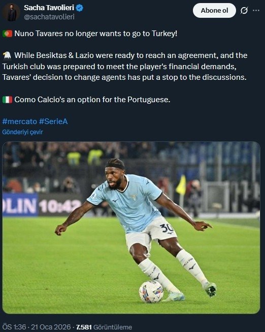 Sky Sport muhabiri Sacha Tavolieri, Nuno Tavares’in Türkiye’ye gitmek istemediğini açıkladı. Belçikalı gazeteci, Beşiktaş ile Lazio’nun Portekizli futbolcunun transferi için anlaşmaya yakın olduğunu ancak futbolcunun menajerini değiştirme kararı sonrası görüşmelerin durduğunu belirtti.