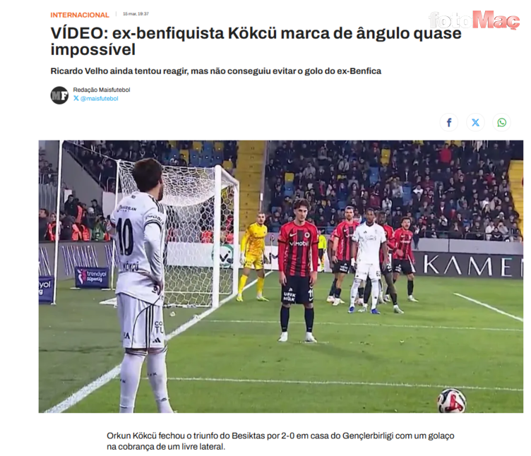 İşte “Eski Benfica oyuncusu Kökcü, neredeyse imkansız bir açıdan gol attı” başlıklı yer alan haber.