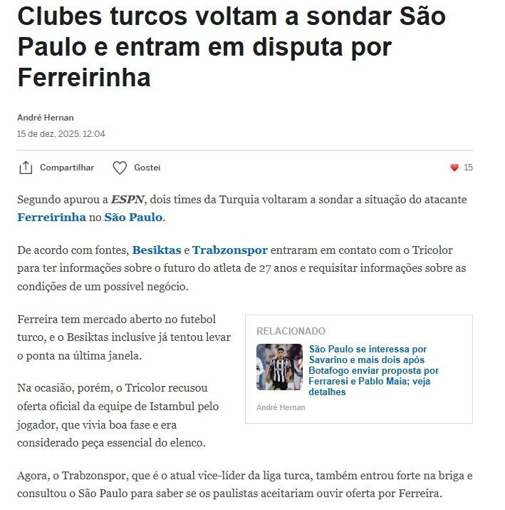 Ocak transfer dönemi öncesinde kadro planlamalarını hızlandıran Trendyol Süper Lig’in iki devi Beşiktaş ve Trabzonspor, sol kanat eklemesi konusunda aynı hedefte buluştu. ESPN Brasil’de yer alan habere göre siyah-beyazlılar ve bordo-mavililer, Sao Paulo forması giyen Ferreirinha’nın durumunu yoklamaya başladı.