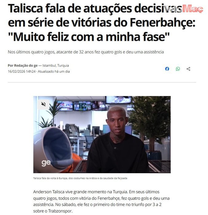 Sarı-lacivertlilerde attığı golle alınan galibiyetin mimarlarından olan Talisca, Brezilya basınına açıklamalarda bulundu.