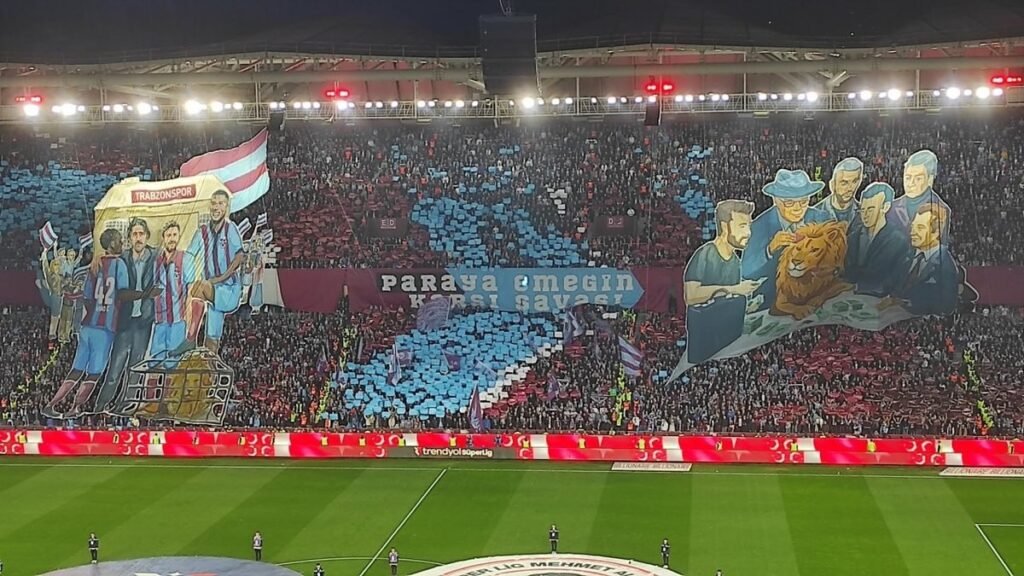 Bordo-mavili taraftarlar tarafından hazırlanan koreografide iki takımı temsilen 2 farklı figür sergilenirken arasında da “Paraya karşı emeğin savaşı!” sloganı yer aldı.