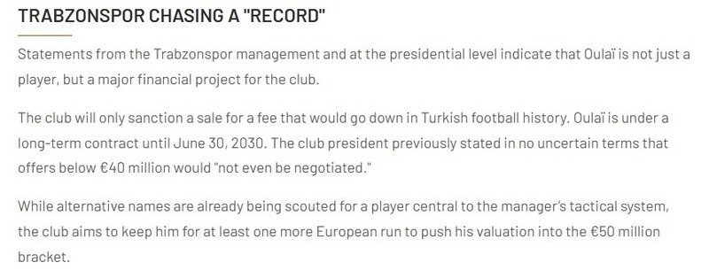 Haberde ayrıca Trabzonspor yönetiminin 40 milyon Euro’nun altındaki teklifler için pazarlık masasına dahi oturmayacağının altı çizildi.